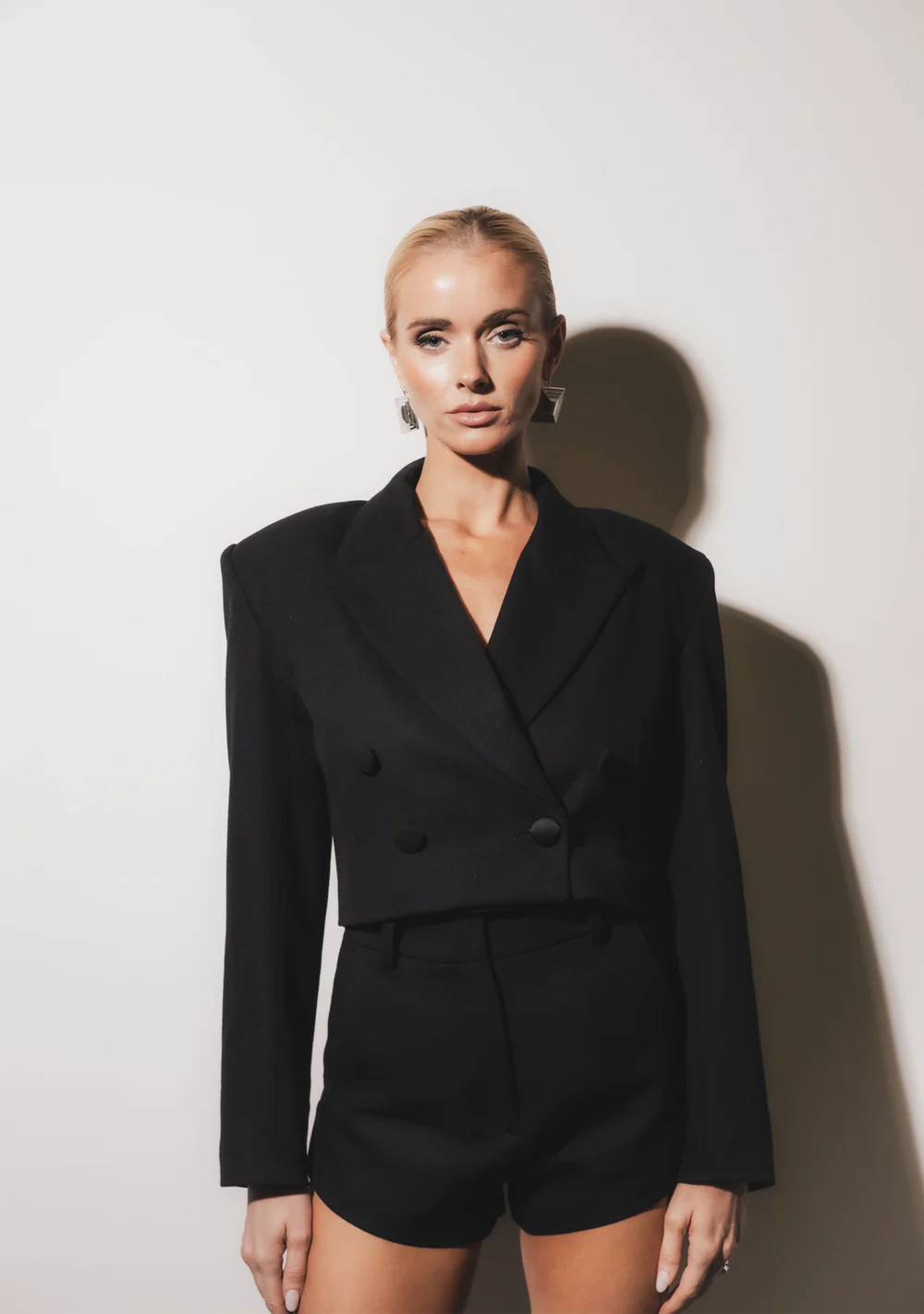 Our cropped double breasted 100% wool blazer and shorts elevate any outfit. The Wool set that will turn heads!