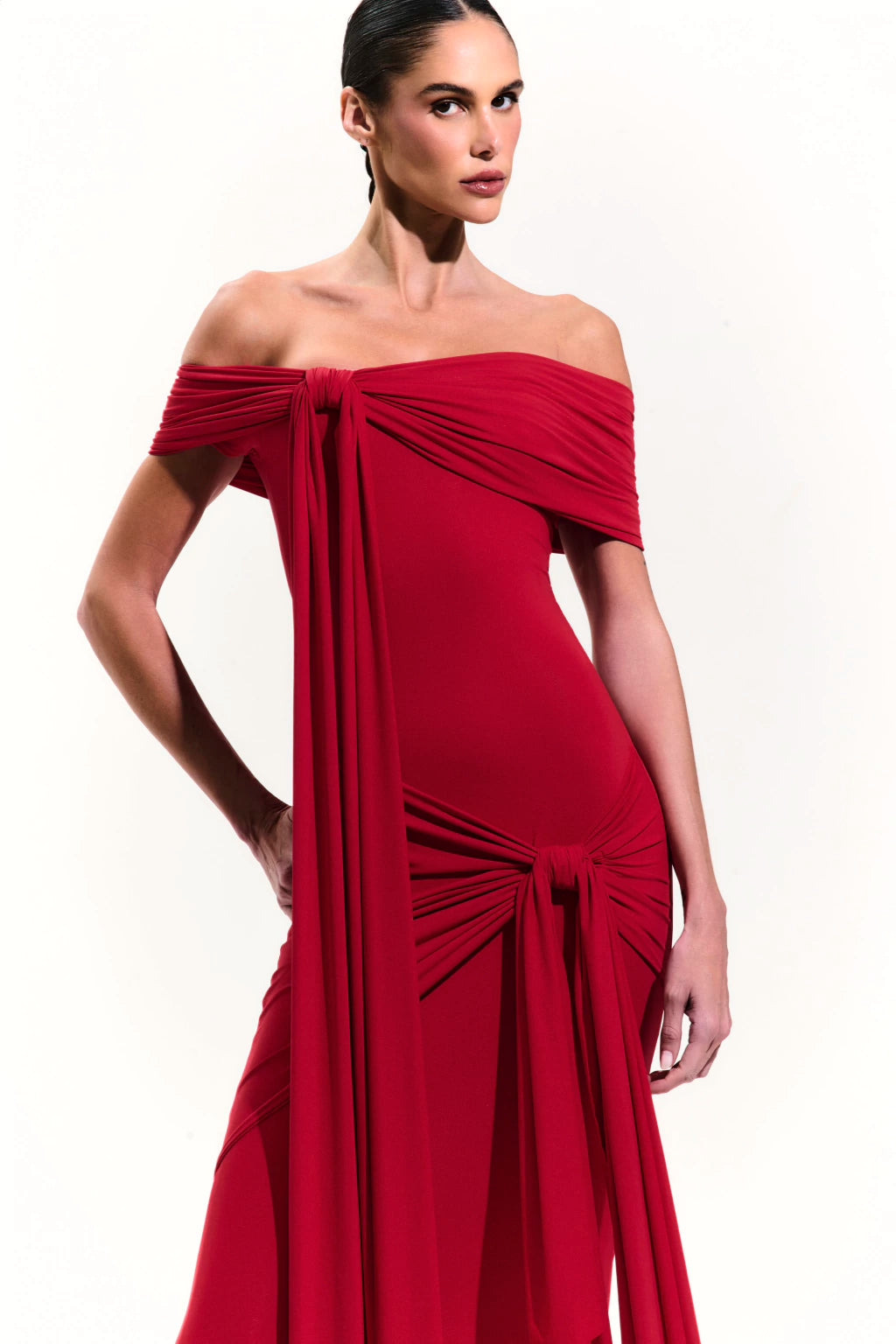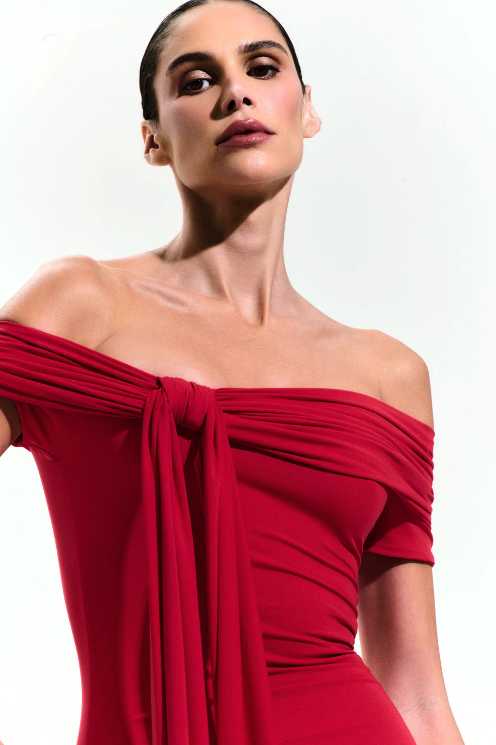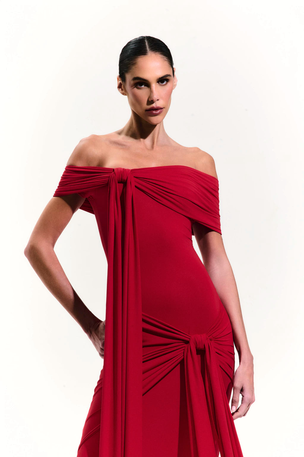Long jersey dress, shoulder-to-shoulder model, with front knots that form an elongated fit.