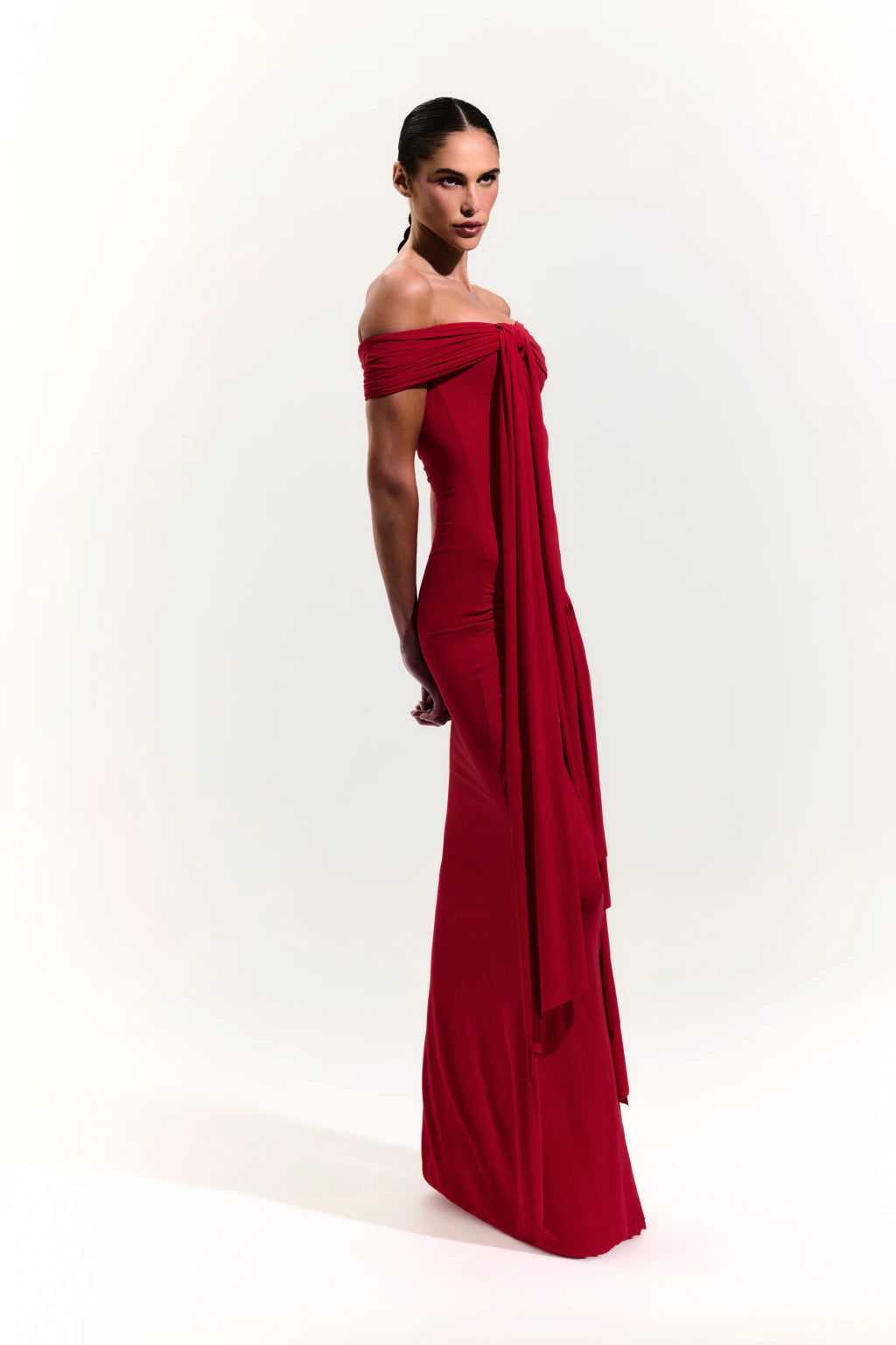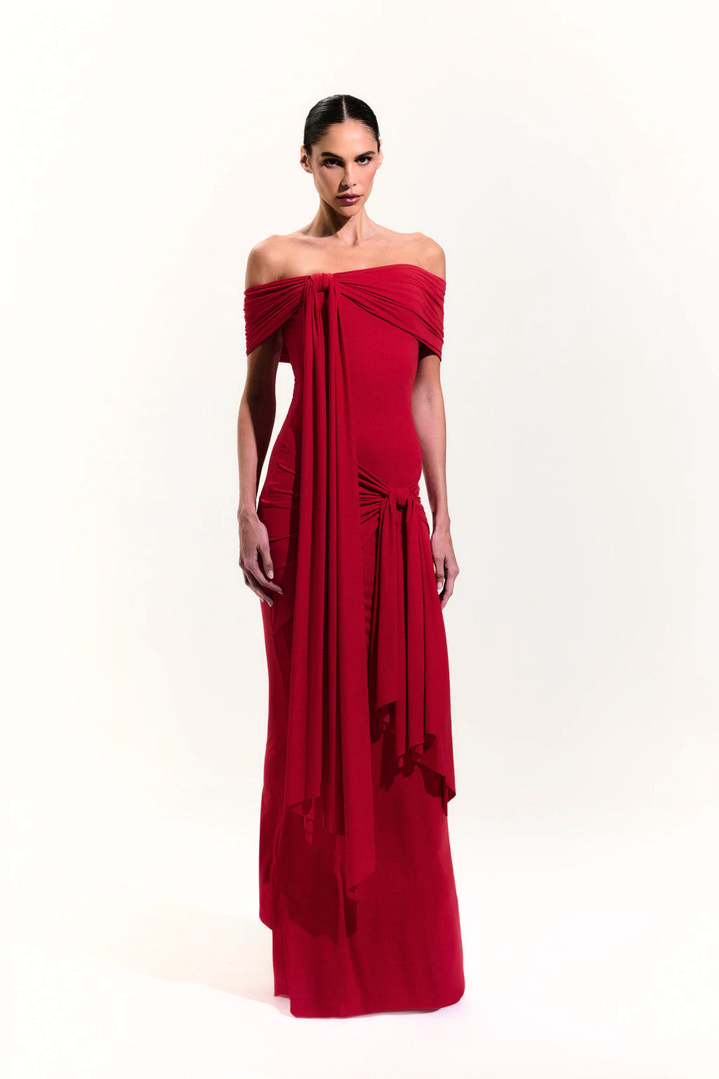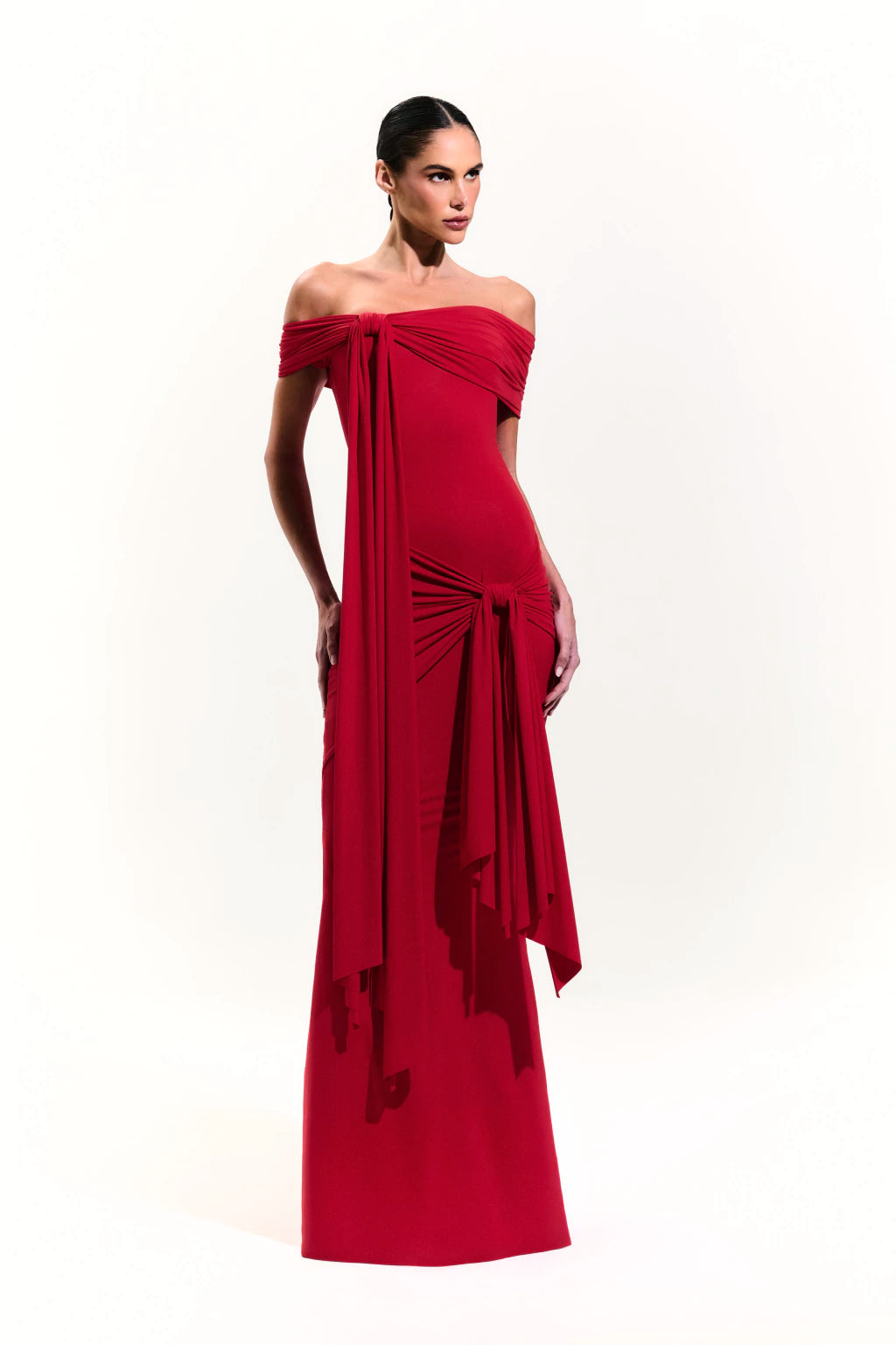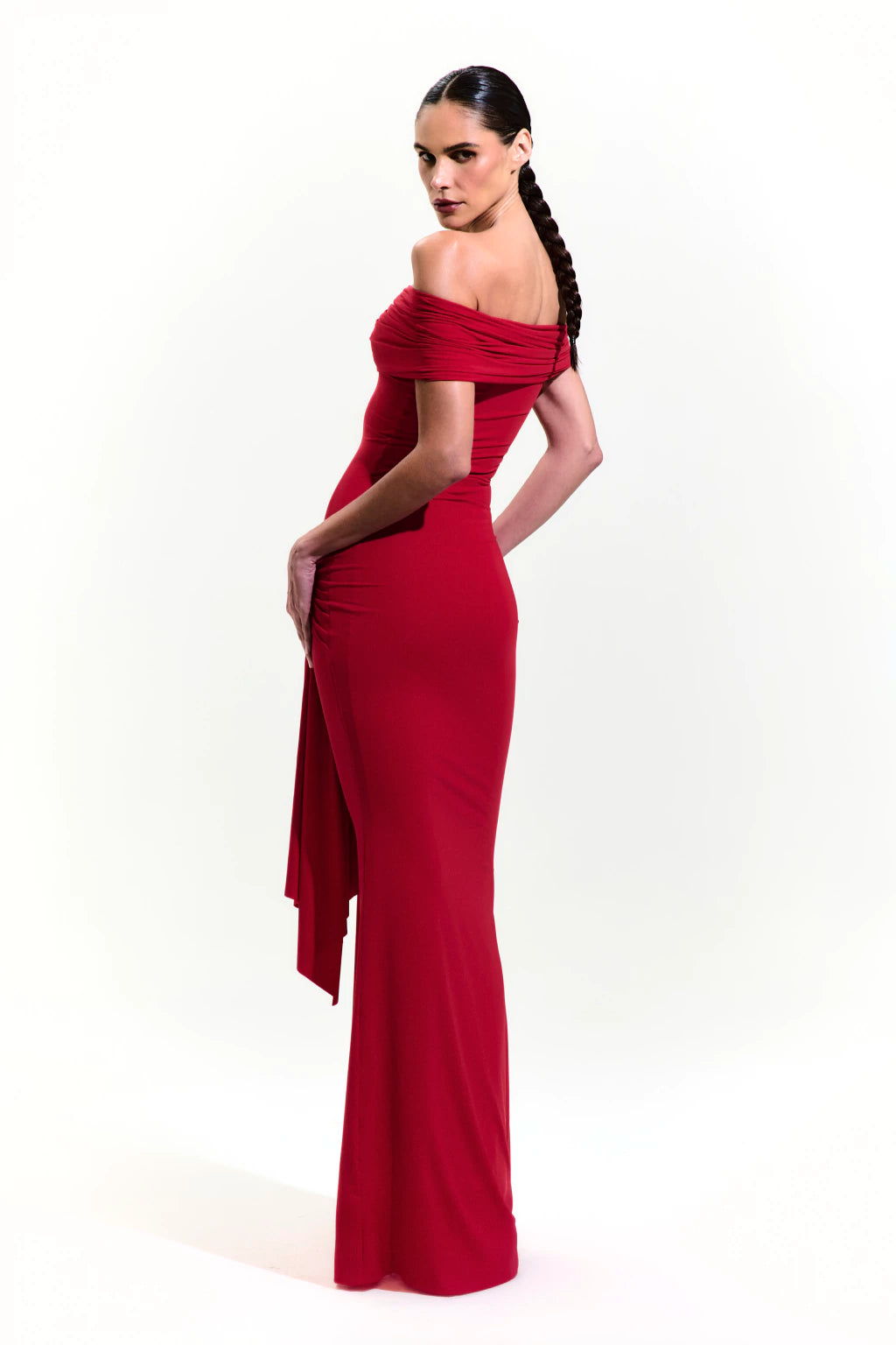 Long jersey dress, shoulder-to-shoulder model, with front knots that form an elongated fit.