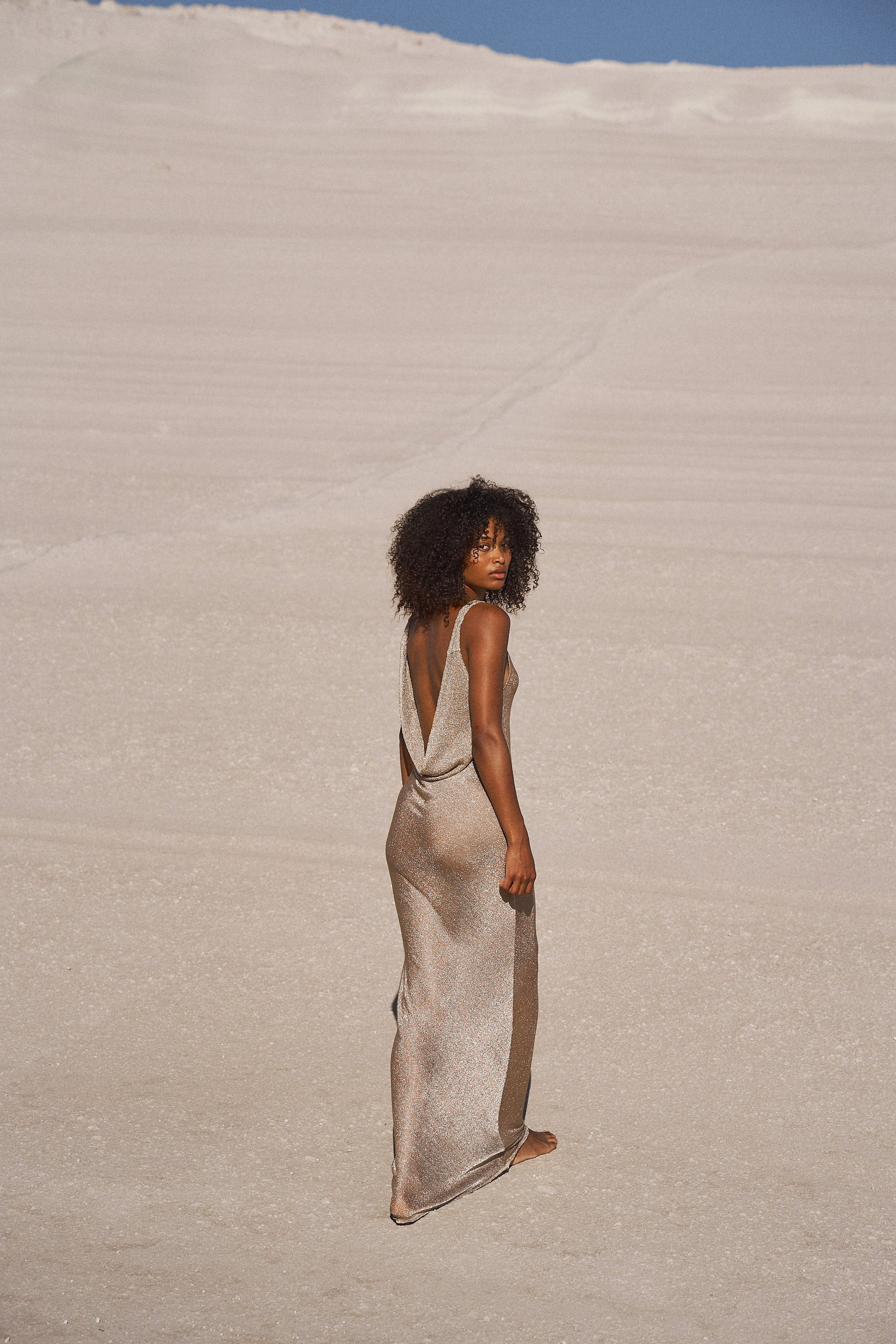 Floor skimming silhouette with sexy low cowl back