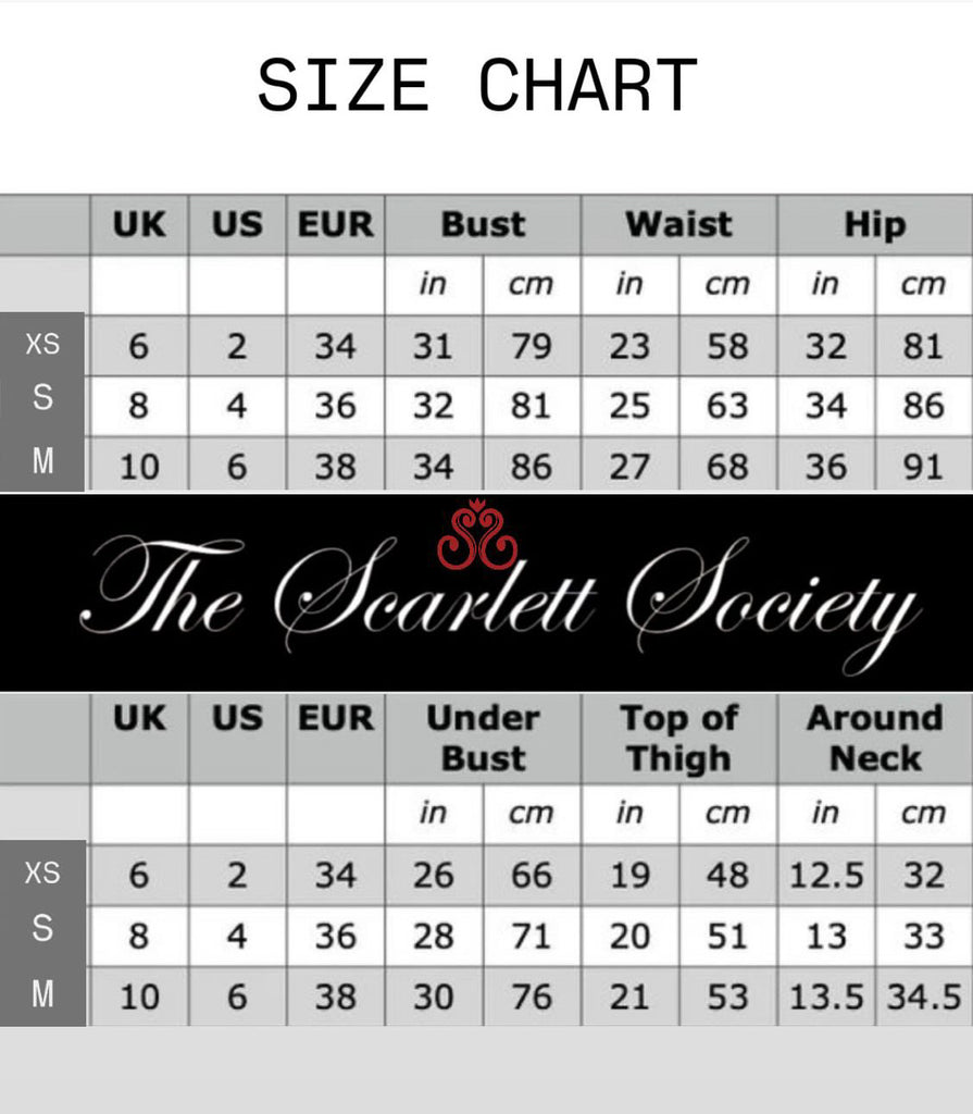 XS - 6 S - 8 M - 10 At no extra cost we offer a bespoke piece made to your measurements. Please email info@labelloftlondon.com, we will need your Bust, waist & hip measurements.
