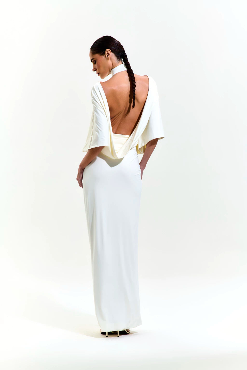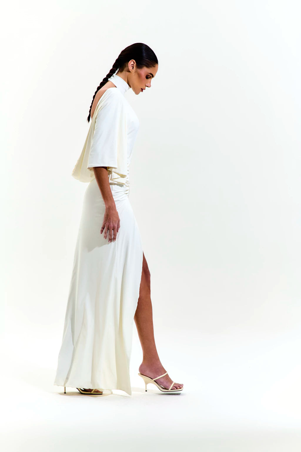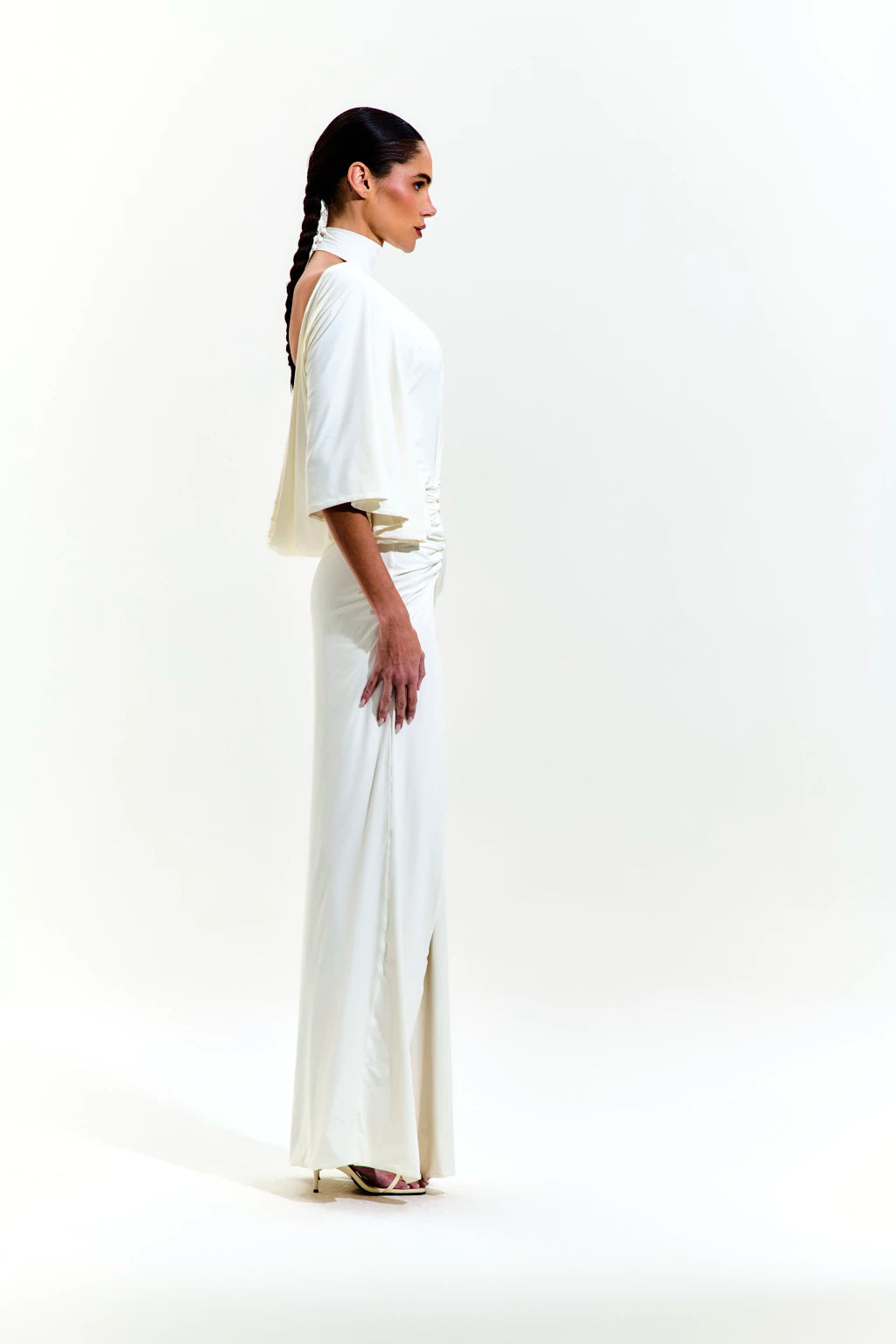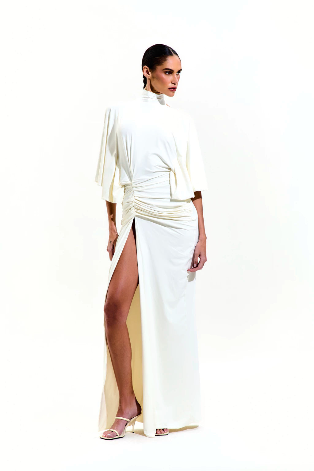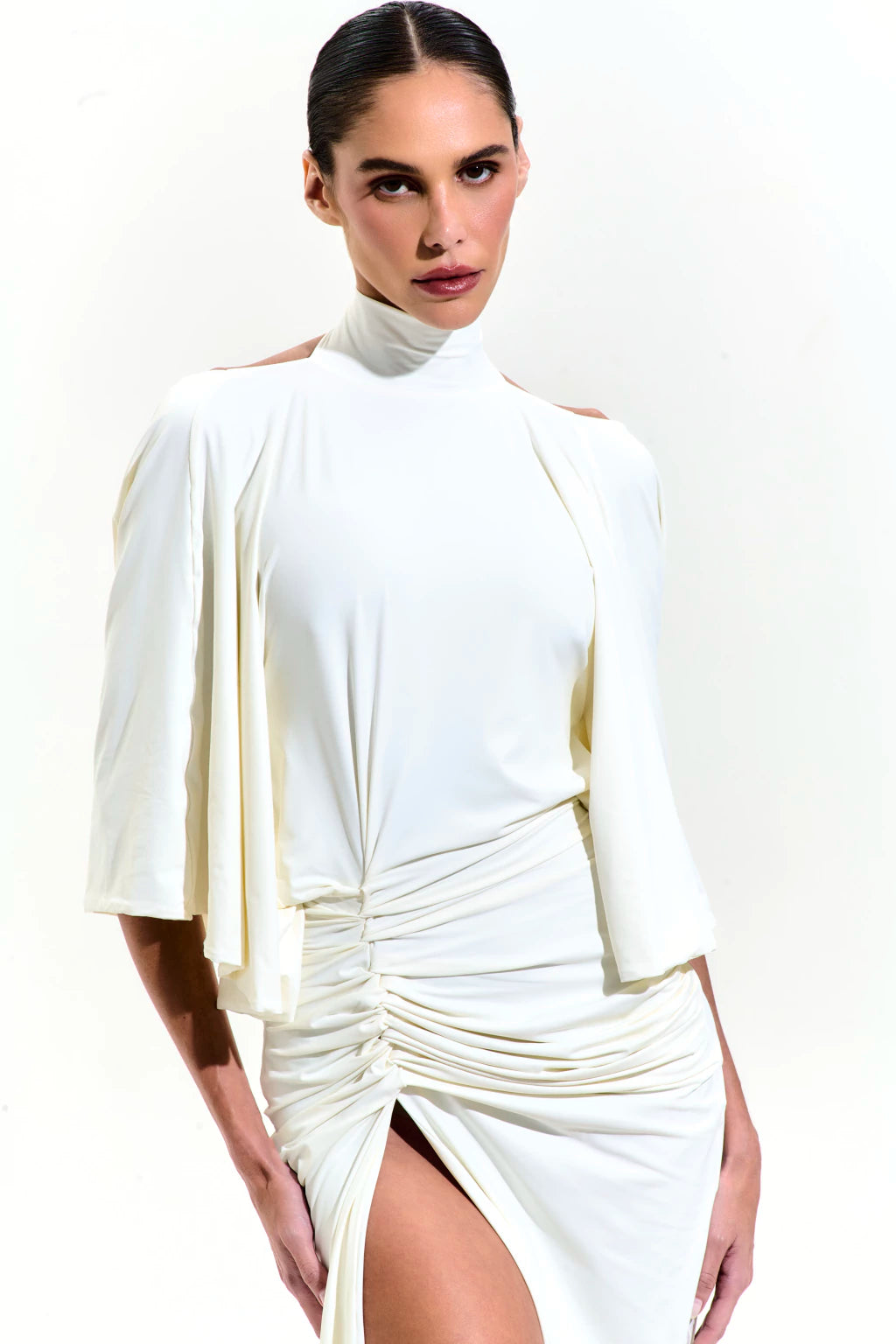 Wide and fluid sleeve, turtleneck with lined button closure and front cutout that subtly reveals the skin.
